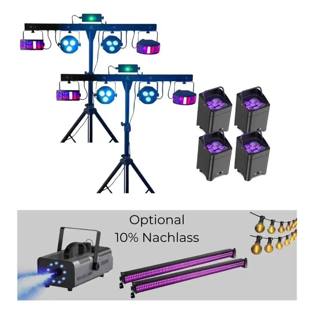 Dein Tanzflächen-Boost: 2× Partylichtanlage All-in-One + Akku-Ambientelicht (4er Set) für Stimmung im Raum. Optional mit Lichtleisten und Nebelmaschine für den Club-Effekt.